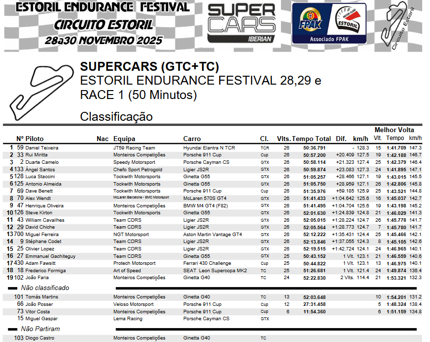 CPV/Iberian Supercars: Daniel Teixeira vence GTC em corrida com Safety Car